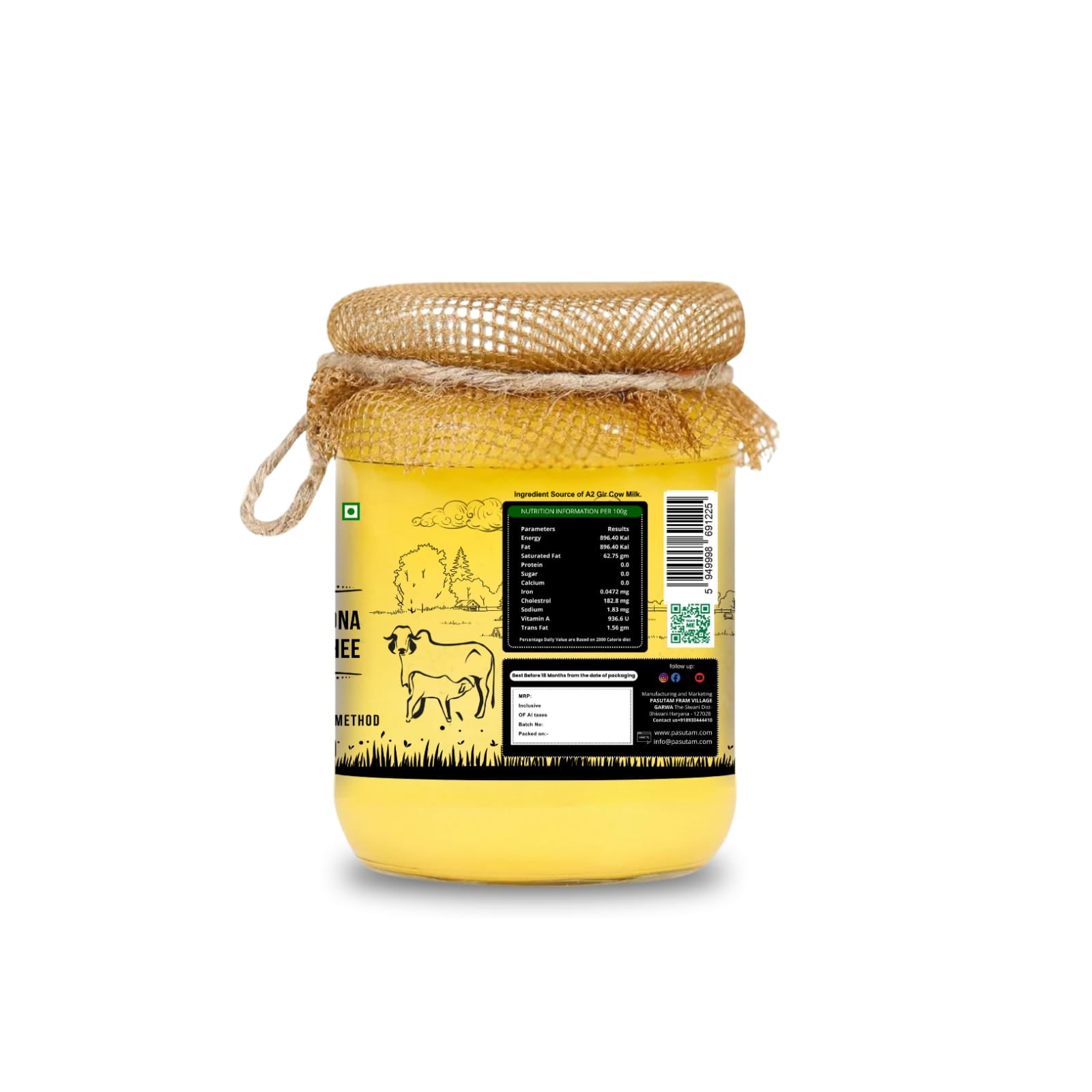 Pure A2 Gir Cow Milk: Sourced from indigenous desi cows that are free-grazed on organic pastures, the milk used for our ghee is rich in A2 beta-casein protein. This type of protein is known for being easier to digest and healthier, making our ghee a perfect choice for those seeking a wholesome diet.